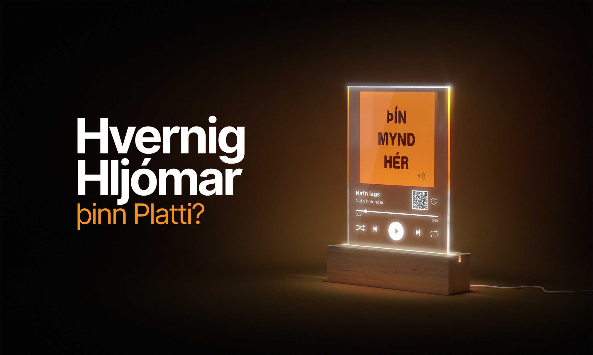 Allir Tónlistarplattar hafa QR kóða en hvað gerir hann? Þegar þú skannar kóðann með símanum þínum spilast lagið sem var valið við hönnun Plattans. Tónlistin lifnar við með einu skanni!